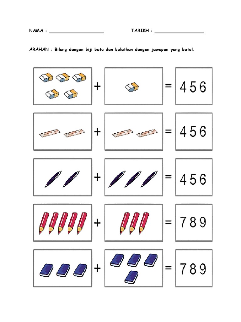 Lembaran Kerja Matematik Prasekolah Operasi Tambah Dan. Murid perlu menguasai membilang sehingga 20 kerana kemahiran ini akan digunakan untuk operasi tambah menggunakan bentuk lazim. Objek yang tidak terdapat dalam kumpulan tertentu.
